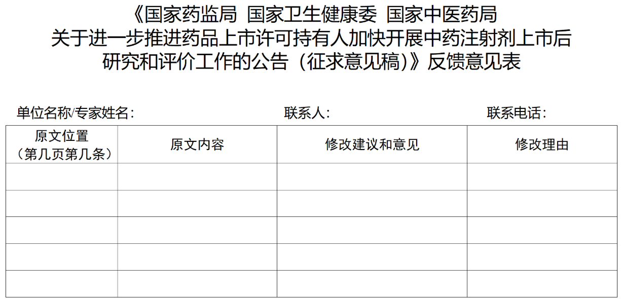 3.《国家药监局 国家卫生健康委 国家中医药局关于进一步推进药品上市许可持有人加快开展中药注射剂上市后研究和评价工作的公告(征求意见稿)》意见反馈表