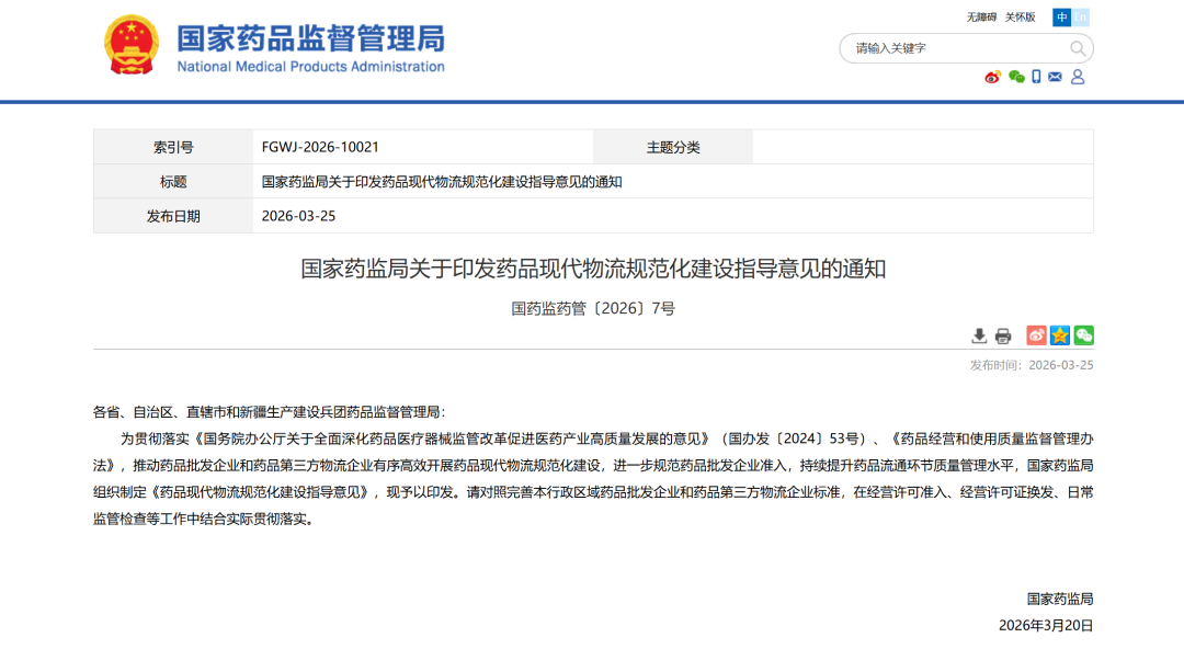 2026年03月25日,国家药监局发布《药品现代物流规范化建设指导意见》,文件强调以GSP为基础,通过机械化、自动化设备(如自动分拣、输送系统)和独立的信息管理系统,实现药品从入库到运输全过程的规模化、集约化、数字化、智能化、可追溯。该文件自公布之日起施行!